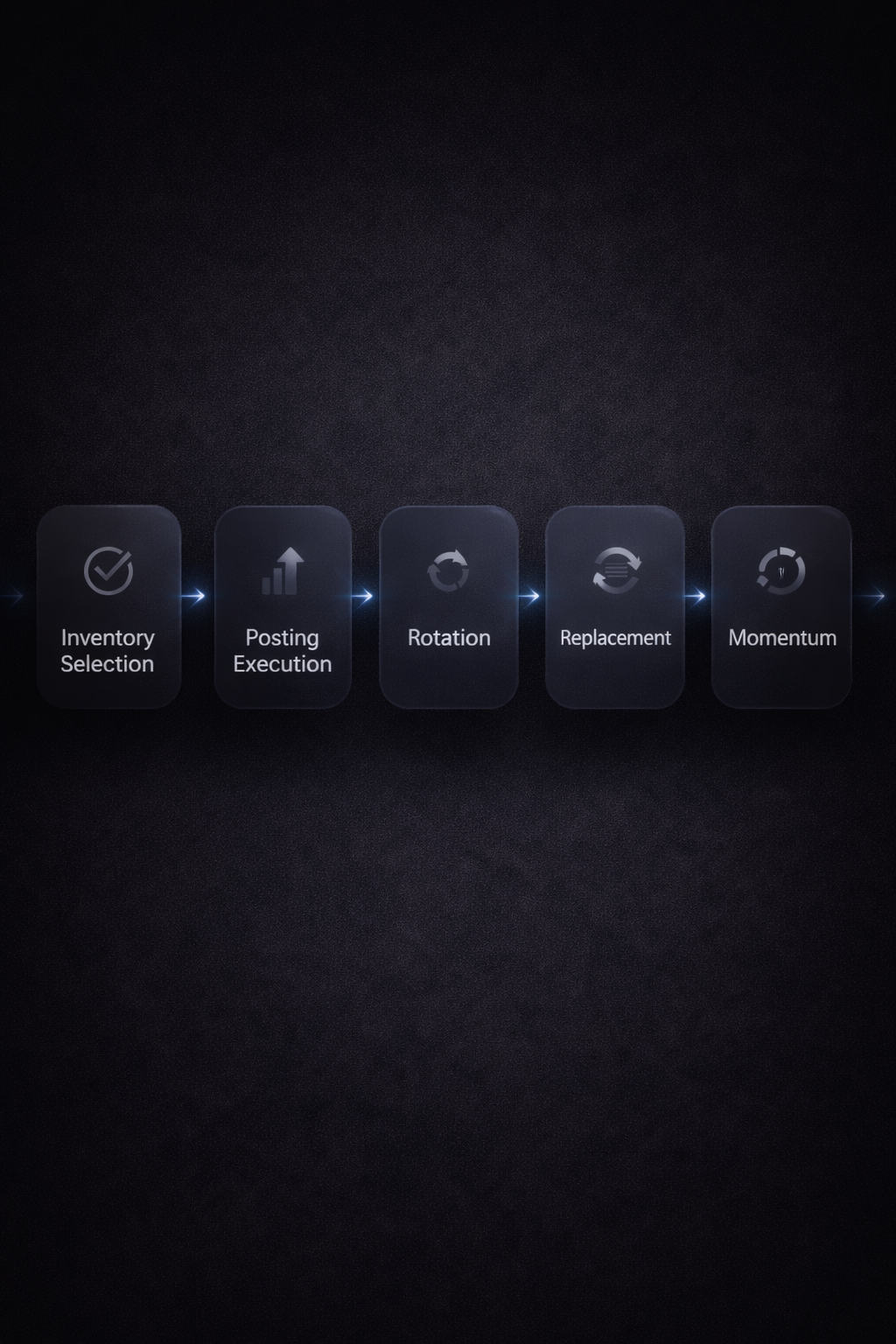 Rather than selling ads or software, we manage how inventory is selected, prioritized, posted, rotated, and replaced, allowing Marketplace to function as a reliable internal sales channel.